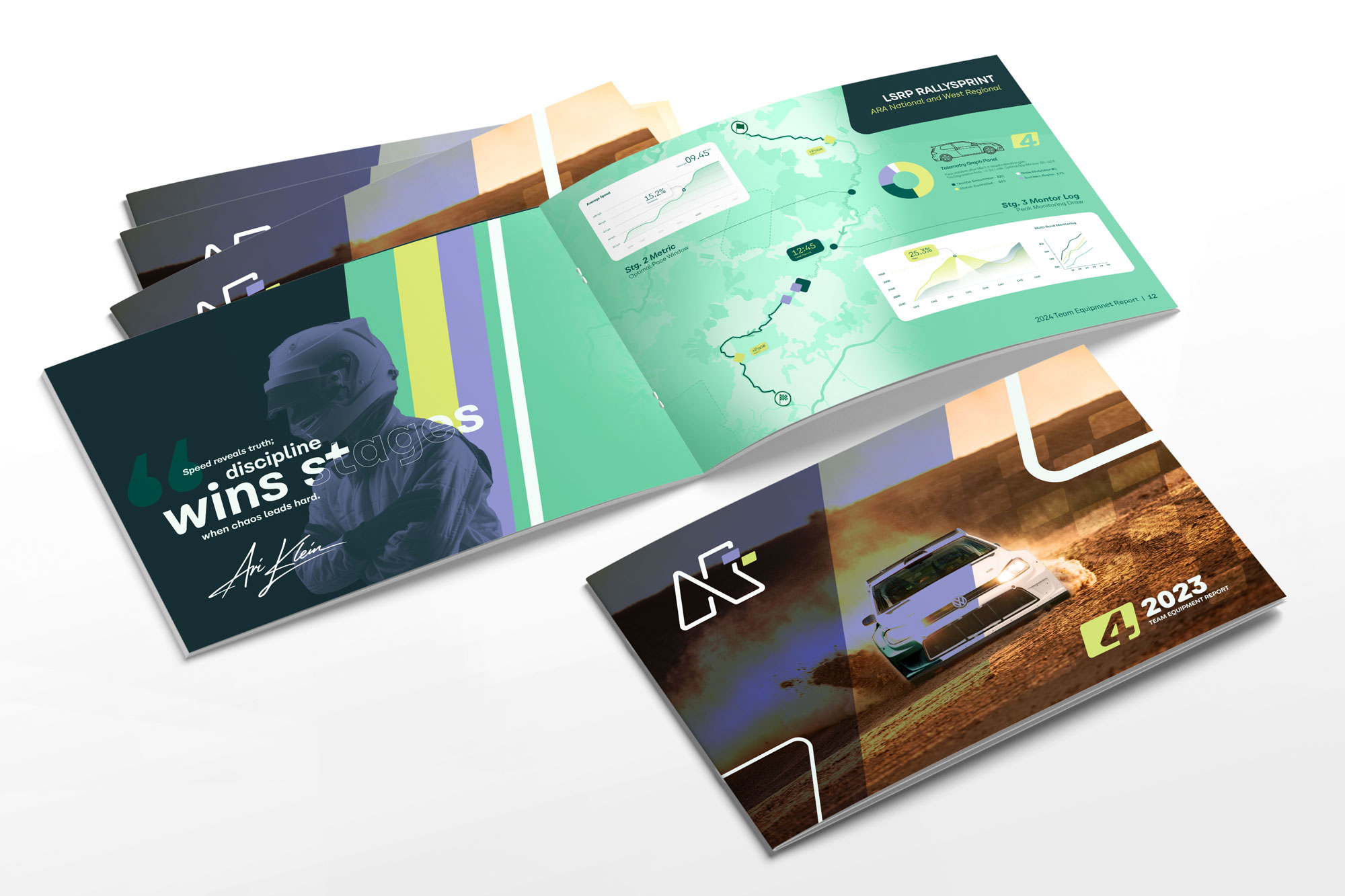 The identity system extends beyond the car into apparel, event graphics, and performance-driven visuals, supported by rally-specific data, numbering, and repeatable patterns. These elements allow the brand to scale seamlessly from vehicle markings to digital dashboards and stage communications, presenting AK Rallysport as a disciplined, technically focused team where design supports performance, consistency, and execution.