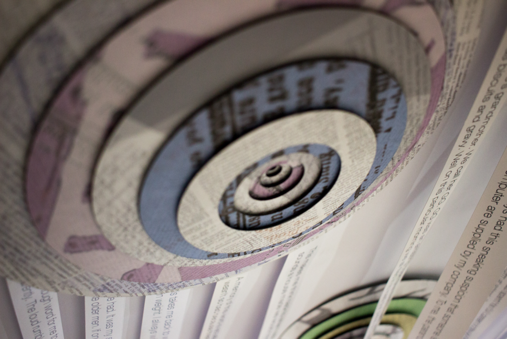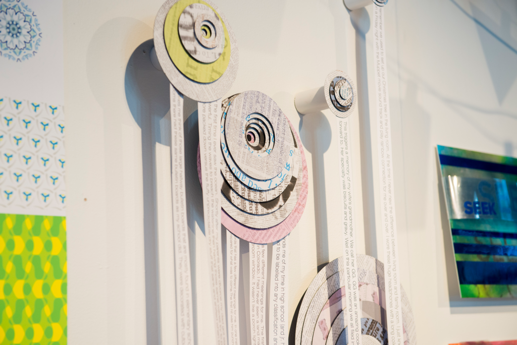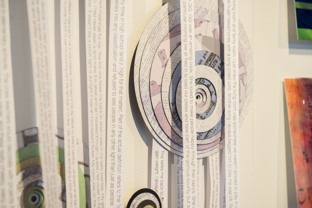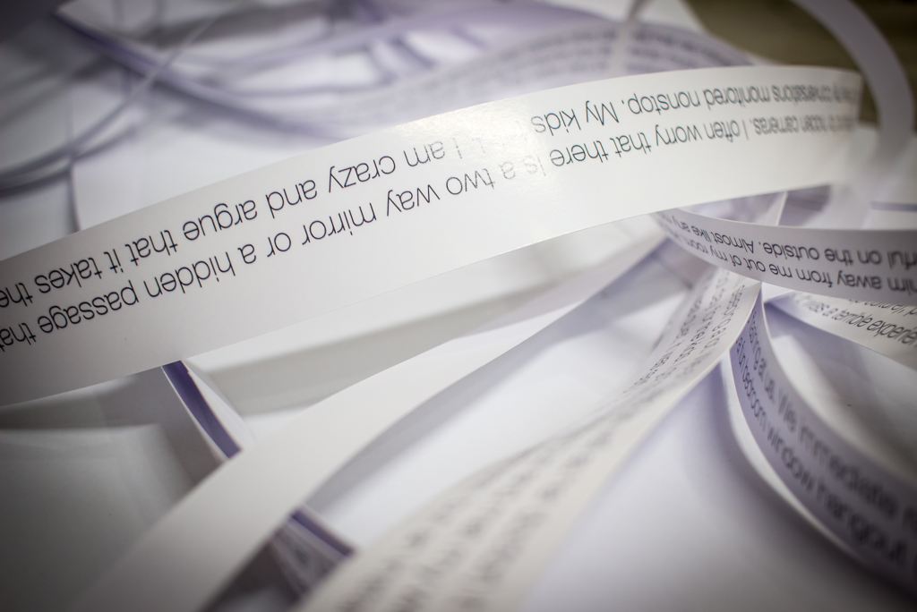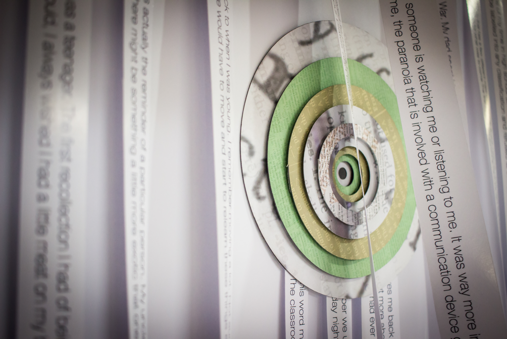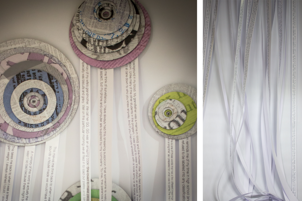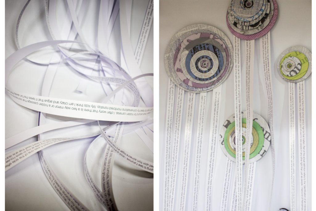 This is a project that I refer to as Rabbit Hole. It started as a writing exercise, picking random words from the dictionary and writing about the first memory that word activated. These lengthy stories took me down a “rabbit hole” of memories and emotional triggers, and I assembled these writings as a literal “root” of what these words and definitions mean to me. These strips are paired with the “hole.” It was hard to portray the visual scale of these with images, but the text ribbons range from 8ft to 12ft and are meant to curl up when they hit the floor as if trailing off into a tangle of roots.