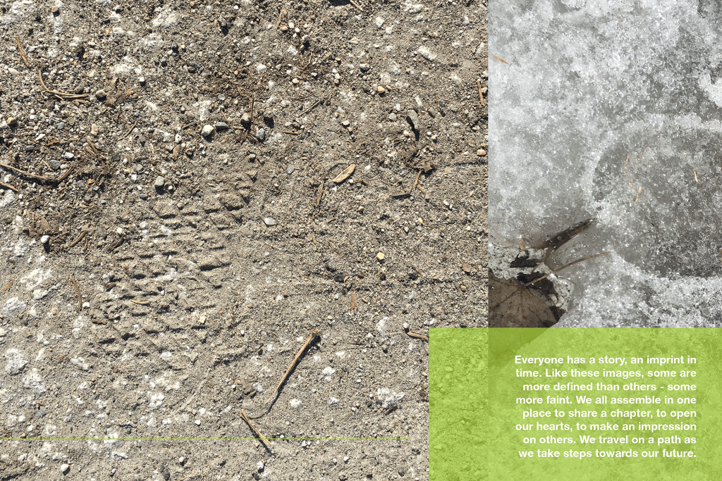 This was a project I worked on for for my first Grad School residency in Vermont. The thinking behind my approach had to do with the impressions people made. Not only the impressions they made on me and the warmth and welcome that I felt, but more specifically their footprints, the journeys they were on, where they came from, where they were going and the steps they were taking to get there. What better way to portray this than to visualize with the impression of literal footprints. When I arrived, there was still some snow on the ground and there was a lot of mud. This mixture made for some really good footprints. They were everywhere, going in and out of buildings, on the sidewalks and streets.